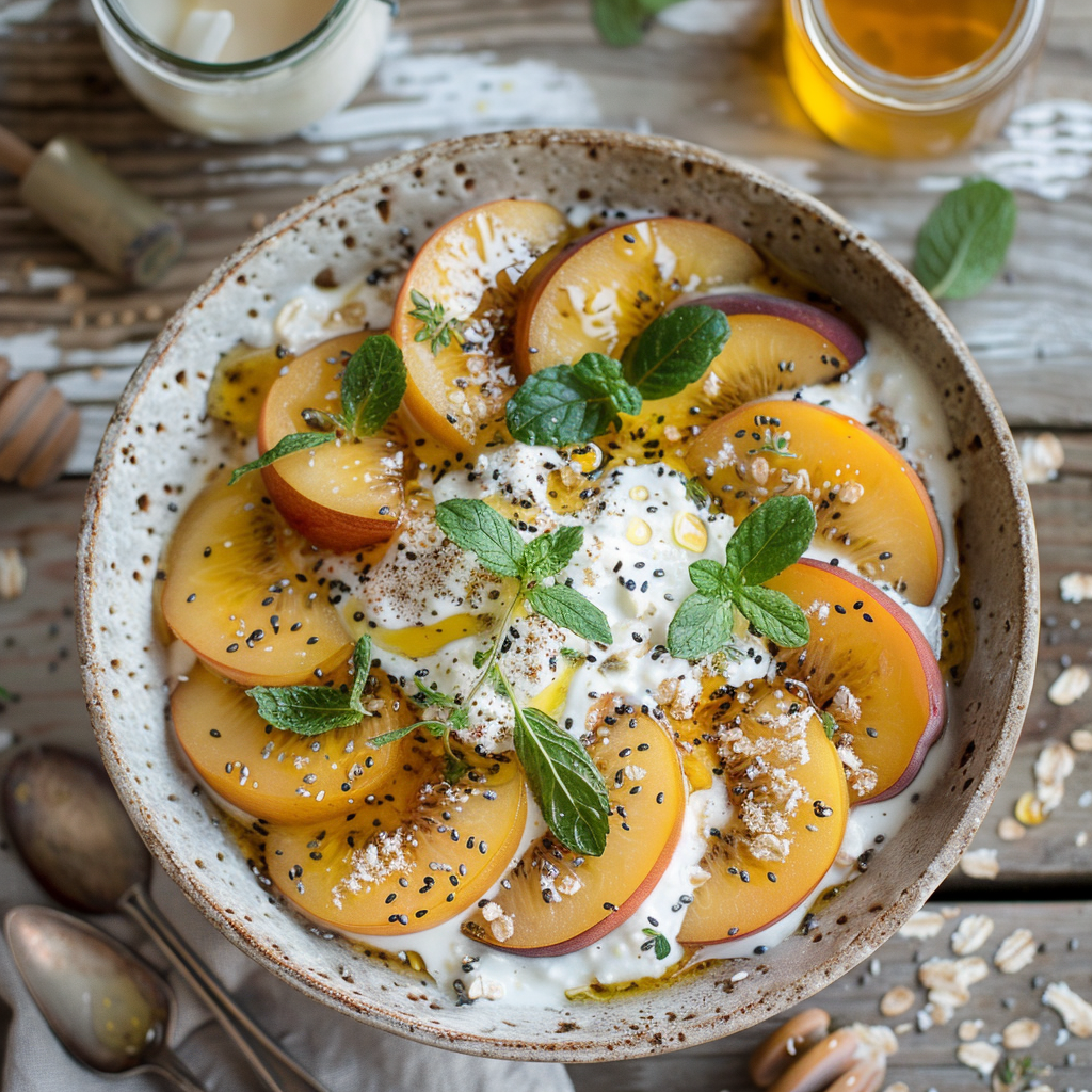 Haferflocken mit Apfelsaft, Nektarinen und Minz- Joghurt mit Honig