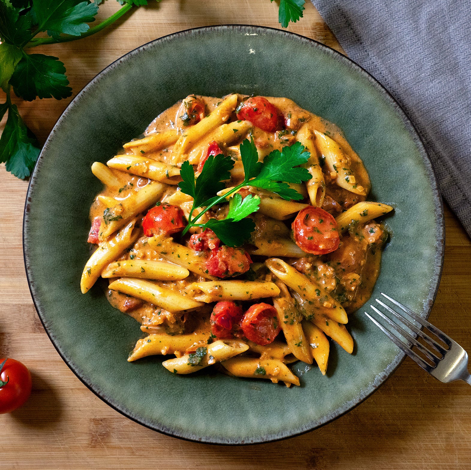 Penne with cherry tomatoes, cream, Parmesan, pepper, parsley and Parmigiano Reggiano