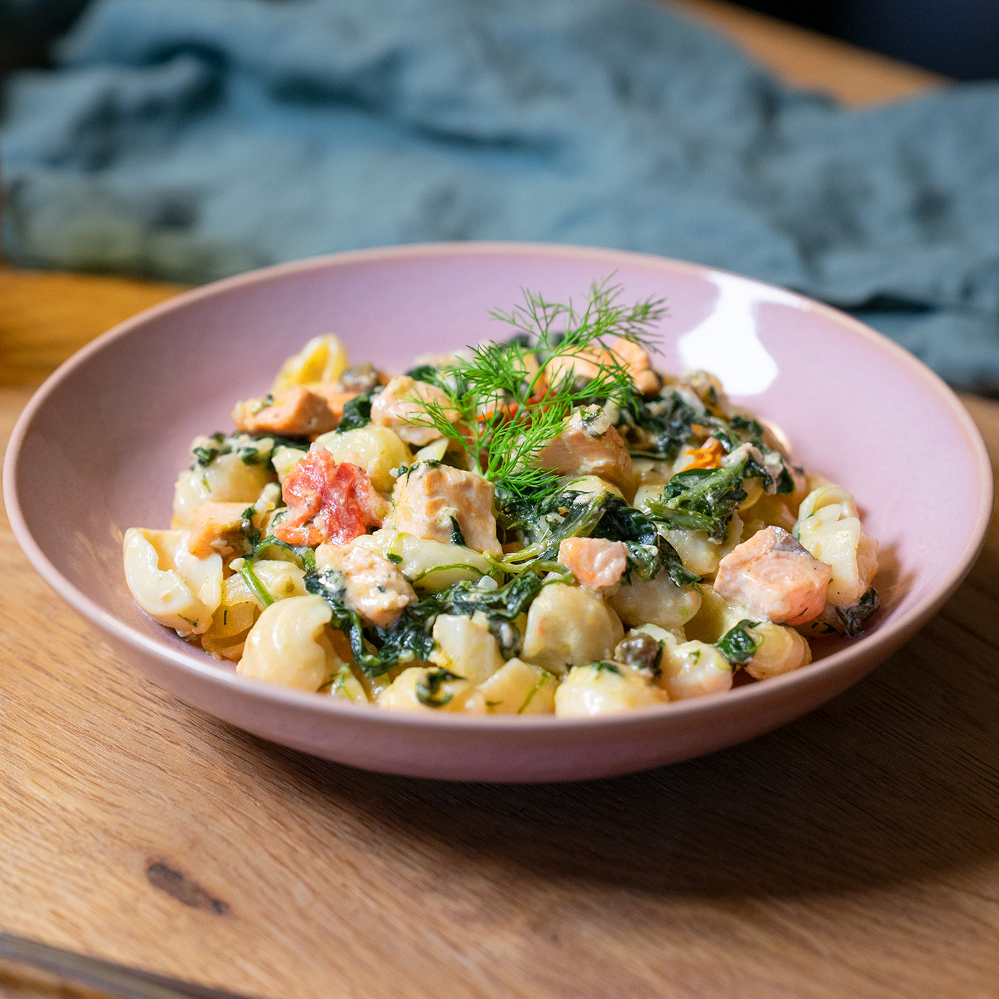Hausgemachte Pasta mit Lachswürfeln, Spinat und Cherrytomaten in cremiger Rahmsauce, verfeinert mit Dill und Kapern