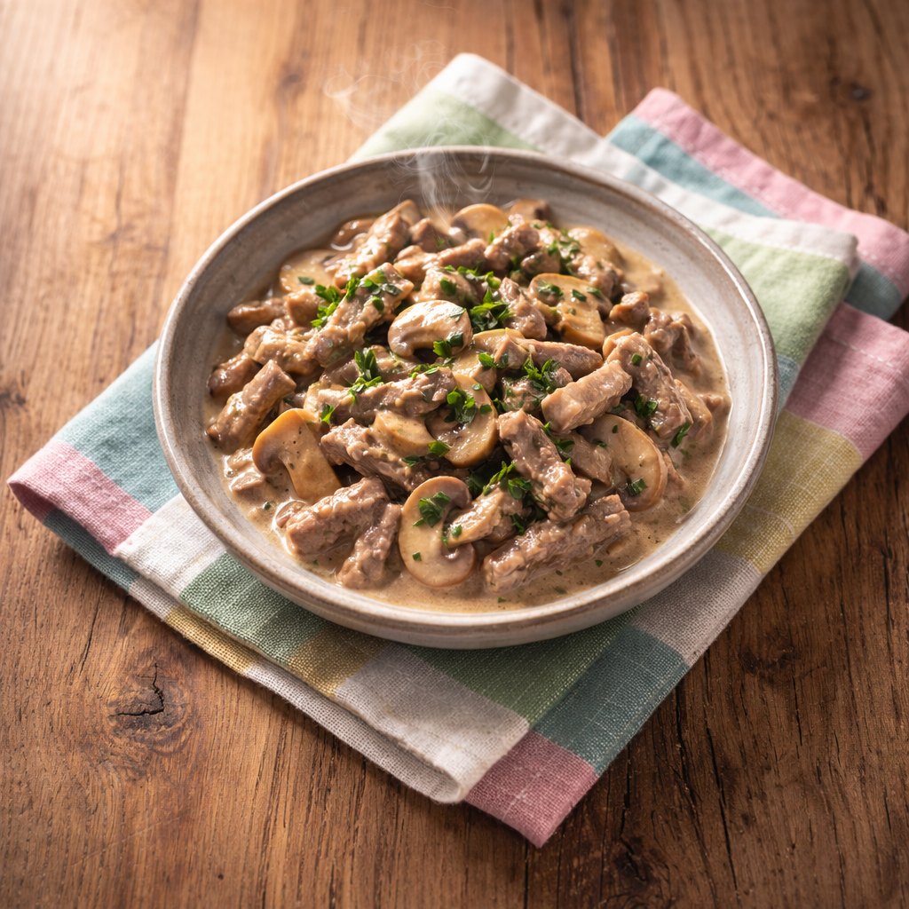 Poulet (CH), Champignons, Halbrahm (MILCH), Kalbsfond (Kalbsknochen, Wasser, Rotwein (SCHWEFELDIOXID), Kalbsfüsse, SELLERIE, Lauch, Randen, Rüebli, Zwiebeln, Tomatenpüree, Rapsöl, Speisesalz, Steinpilze), Weisswein (SCHWEFELDIOXID), Zwiebeln, Petersilie, Rapsöl, Maisstärke, Speisesalz, Pfeffer