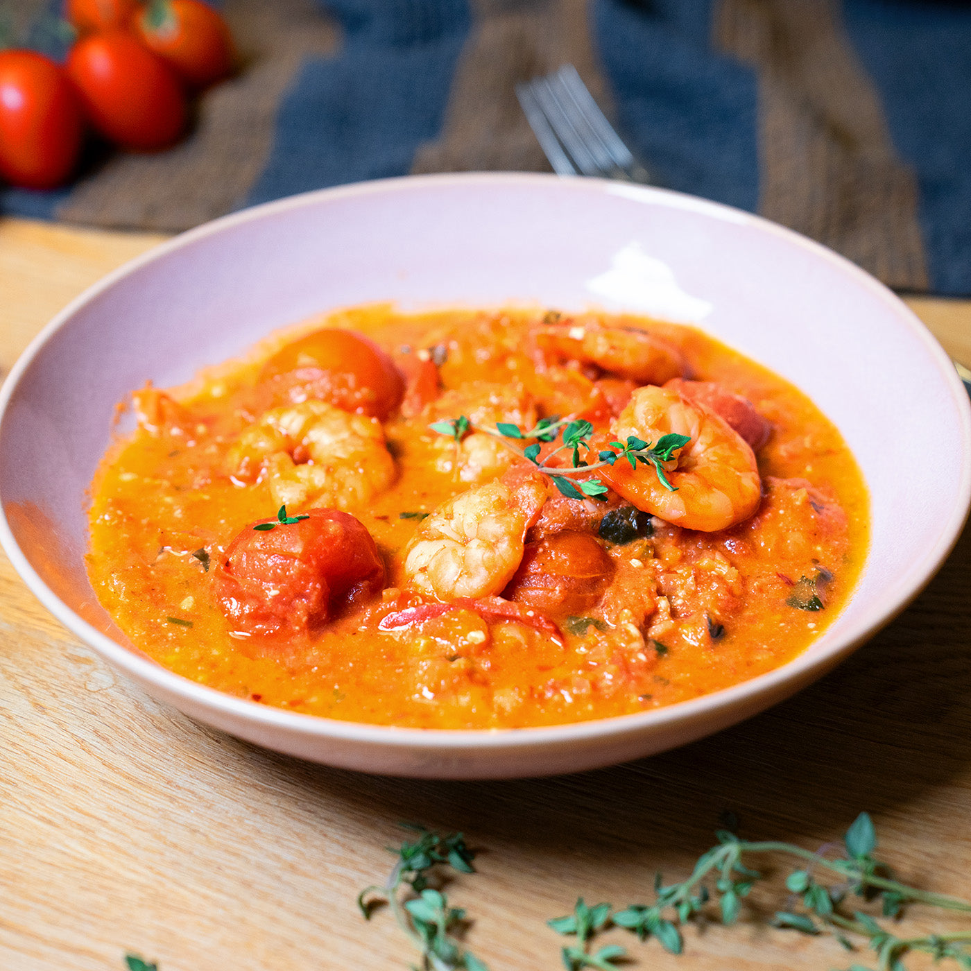 SELVA TIGRE NOIR (Vietnam, CRUSTACES), tomates cerises, tomates polpa (tomates 100%), poivrons, fromage feta (lait de brebis PAST 70%, lait de chèvre PAST 30%, sel 2-4%, échange de présure microbienne, ferments lactiques, chlorure de calcium (Grèce)), huile d'olive extra vierge*, vin blanc (DIOXYDE DE SOUFRE), oignons, purée de tomates (tomates, sel de cuisine), persil, ail, paprika fumé, piments rouges concassés, origan*.