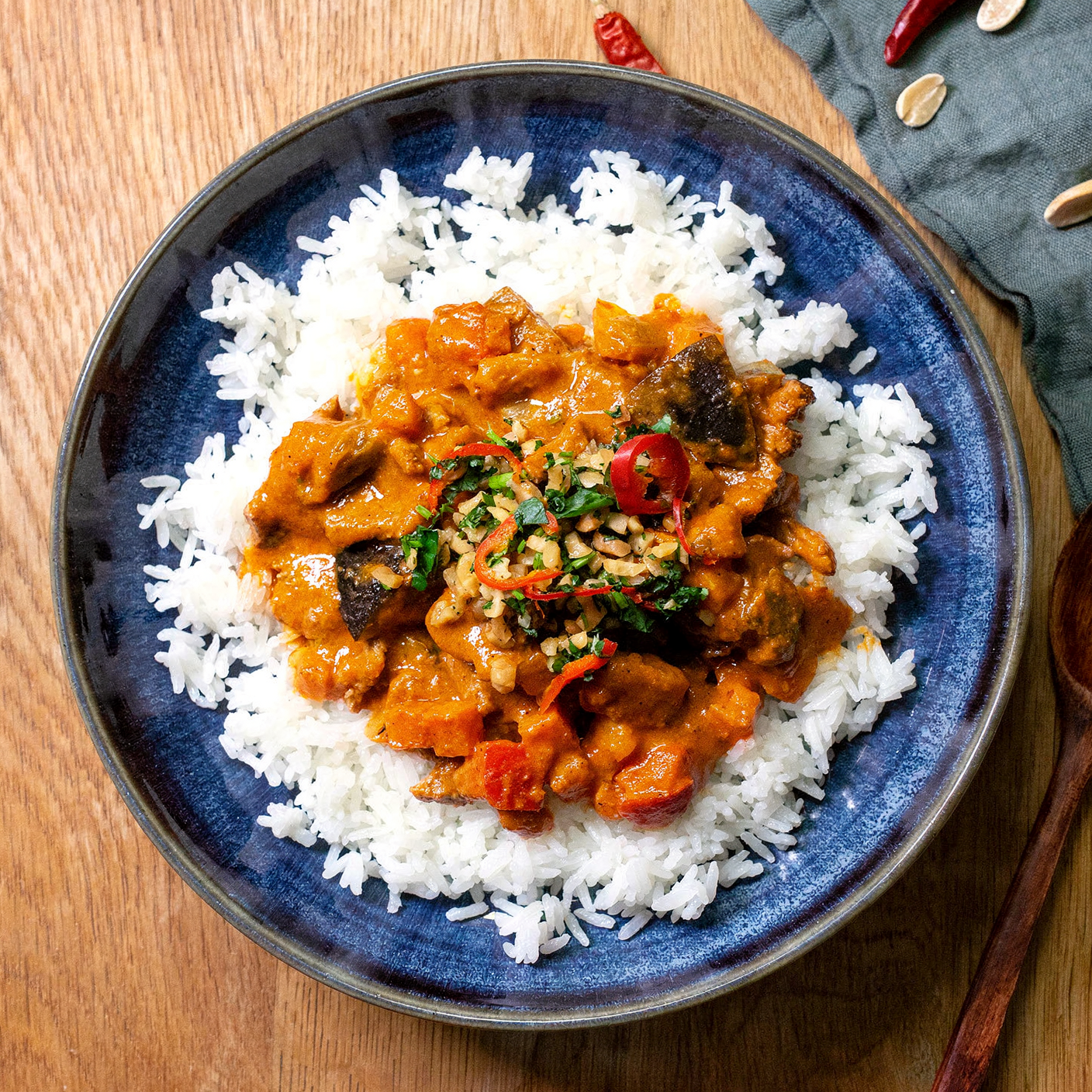 Lanières de bœuf (CH), riz basmati, eau, tomates, pepperoni, aubergines, beurre de cacahuète (CACAHUÈTES), oignons, piments, coriandre, huile de colza, purée de tomates, huile de colza, gingembre Sauce de poisson, sambal oelek, ail, sel de table, graines de coriandre, cumin, paprika en poudre, poivre