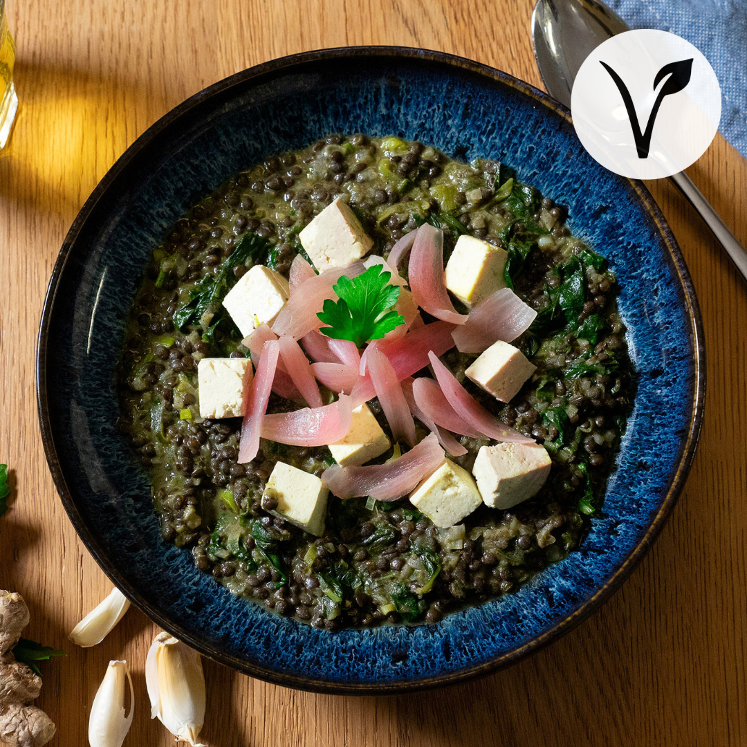 Kokosnussmilch (Kokosnussextrakt 60%, Wasser), Spinat, Belugalinsen , Seidentofu (Wasser, SOJABOHNEN CH), Zwiebeln, Frühlingszwiebeln, Zwiebeln rot, Limetten, Minze grün, Ingwer, Curry-Paste grün (grüne und gelbe Chilis, Knoblauch, Schalotten,Ingwer, Rohrzucker, Zitronengras, Kochsalz, Grünkohl, Basilikum, Wasser, Kaffirlimette, Gewürze, Galgant, Säuerungsmittel: Zitronensäure), Rapsöl, SESAMÖL, Weissweinessig (Weissweinessig, Branntweinessig, Antioxidationsmittel (SCHWEFELDIOXID), Gemüsebouillon (Wasser, Meersalz, Hefeextrakt, Gemüse (Kürbis, Karotten, Pastinaken, Tomaten), Speisesalz, Zucker, Petersilie, Olivenöl, Gewürze), Speisesalz, Zucker, Gewürze (SENFSAMEN), Chilis, Lorbeerblätter