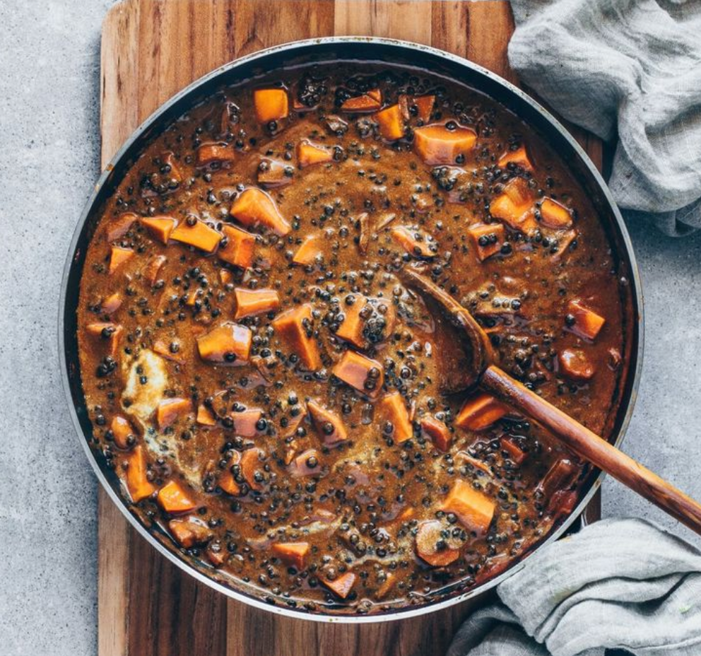Kokosnussmilch (Kokosnussextrakt 60%, Wasser), Spinat, Belugalinsen , Seidentofu (Wasser, SOJABOHNEN CH), Zwiebeln, Frühlingszwiebeln, Zwiebeln rot, Limetten, Minze grün, Ingwer, Curry-Paste grün (grüne und gelbe Chilis, Knoblauch, Schalotten,Ingwer, Rohrzucker, Zitronengras, Kochsalz, Grünkohl, Basilikum, Wasser, Kaffirlimette, Gewürze, Galgant, Säuerungsmittel: Zitronensäure), Rapsöl, SESAMÖL, Weissweinessig (Weissweinessig, Branntweinessig, Antioxidationsmittel (SCHWEFELDIOXID), Gemüsebouillon (Wasser, Meersalz, Hefeextrakt, Gemüse (Kürbis, Karotten, Pastinaken, Tomaten), Speisesalz, Zucker, Petersilie, Olivenöl, Gewürze), Speisesalz, Zucker, Gewürze (SENFSAMEN), Chilis, Lorbeerblätter