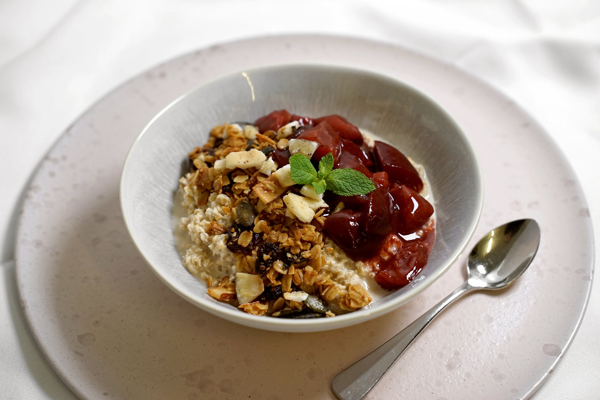 Beginne deinen Tag mit einem Löffel voll Glück! Unsere Overnight Oats mit Zwetschgen-Stückchen, Granola und Kokosflocken sind eine wahre Gaumenfreude. Die Basis bildet cremiger, über Nacht eingeweichter Hafer, verfeinert mit frischen Zwetschgenstücken, die eine natürliche Süsse und Saftigkeit in das Gericht bringen. Knuspriges Granola sorgt für den perfekten Crunch, während zarte Kokosflocken einen exotischen Hauch hinzufügen. Dieses ausgewogene Frühstück ist nicht nur ein Fest für die Sinne, sondern versorgt dich auch mit wichtigen Nährstoffen für einen energiegeladenen Start in den Tag.
