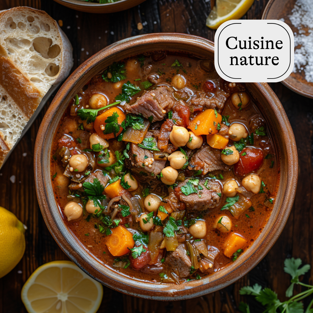 Orientalischer Eintopf mit Wurzelgemüse, Lamm, Ras el Hanout, Tomaten und Kichererbsen