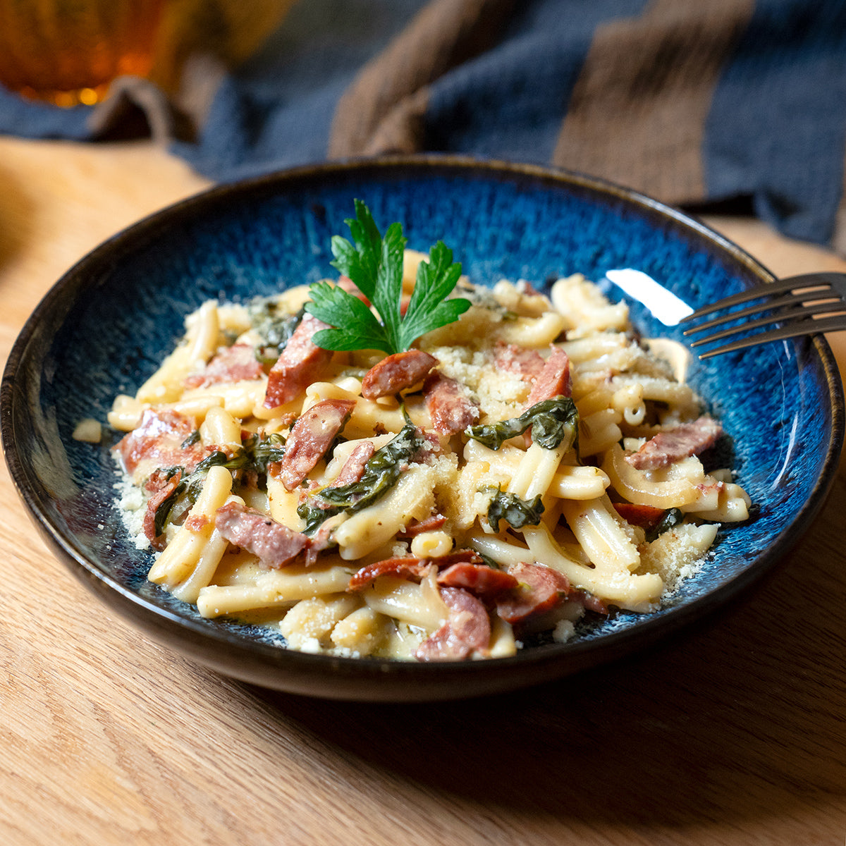 mit geräucherter Schweinswurst, roten Zwiebeln, Spinat, Weisswein, Parmesan, Rahm und Sbrinz