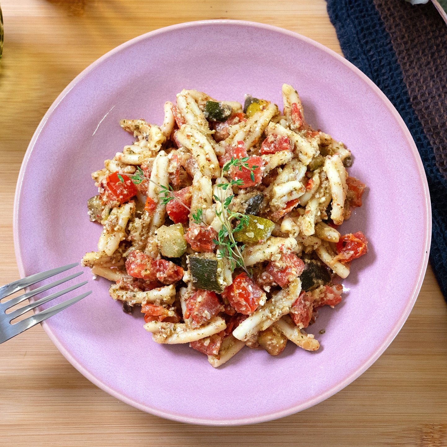 Hausgemachte Pasta mit Tomaten, Zucchetti, Mandeln, Basilikumpesto und Pecorino Romano