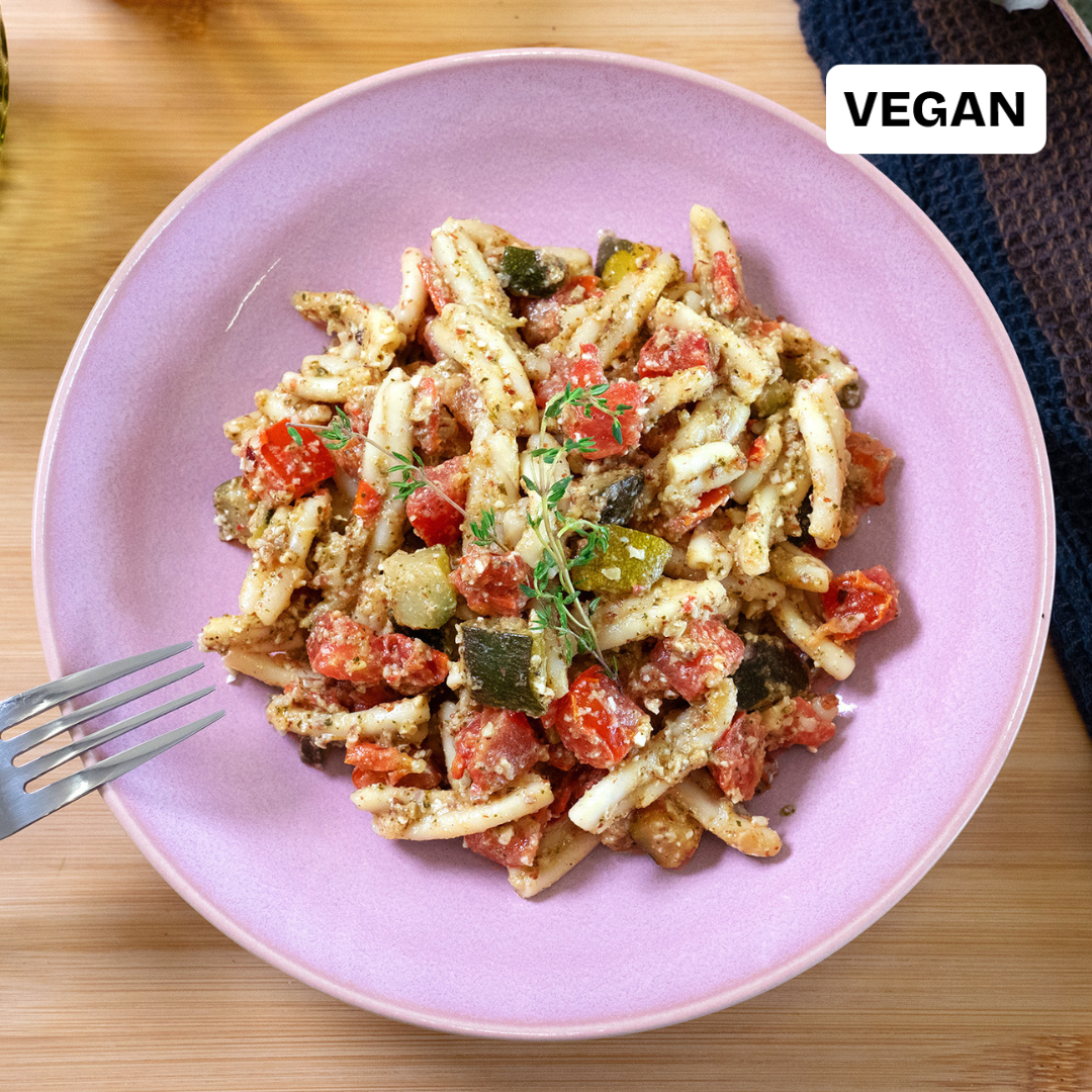 Casarecce (Hartweizengriess (GLUTEN), Wasser, Speisesalz), Tomaten, Zucchetti, Basilikumpesto (Basilikum, Sonnenblumenöl, Olivenöl*, Pecorino Romano (LAKTOSE), Zwiebeln, Pinienkerne, Knoblauch, Ascorbinsäure), Mandeln (SCHALENFRÜCHTE), Olivenöl*, Speisesalz, Knoblauch, Rapsöl, Pfeffer