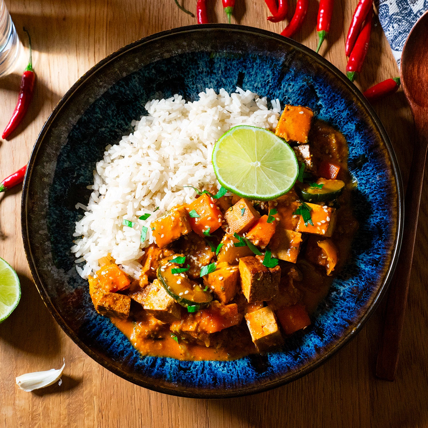 Jasminreis (Jasminreis, Wasser, Salz), Tofu* geräuchert (Wasser, BIO SOJABOHNEN (EU,CH)), Kokosnussmilch (Kokosnussextrakt, Wasser), Gemüsebouillon (Meersalz, Hefeextrakt, Gemüse (Kürbis, Karotten, Pastinaken, Tomaten), Speisesalz, Zucker, Petersilie, Olivenöl, Gewürze),Zucchetti, Rüebli, Peperoni, Brokkoli, Rapsöl, Zwiebeln, Tomatenpüree (Tomaten, Kochsalz), Sojasauce (Wasser, SOJABOHNEN, Kochsalz, Alkohol), Rote Currypaste (Würzmischung (Kochsalz, Tomatenpulver, Zwiebeln, Rohzucker, Chilipulver, Paprikapulver, Paprikaflocken), Zitronengras, Rapsöl, Wasser, Kokosnuss, Maisstärke, Tomatenkonzentrat, Ingwer, Kaffirlimonenblätter, Galangawurzel, Knoblauch, Kurkuma, Cayennepfeffer), Sesamöl (Öl aus gerösteten SESAMSAMEN), Rohr-Rohzucker, Maisstärke, SESAM, Speisesalz, Zitronengras, Kaffir- Limesblätter, Pfeffer