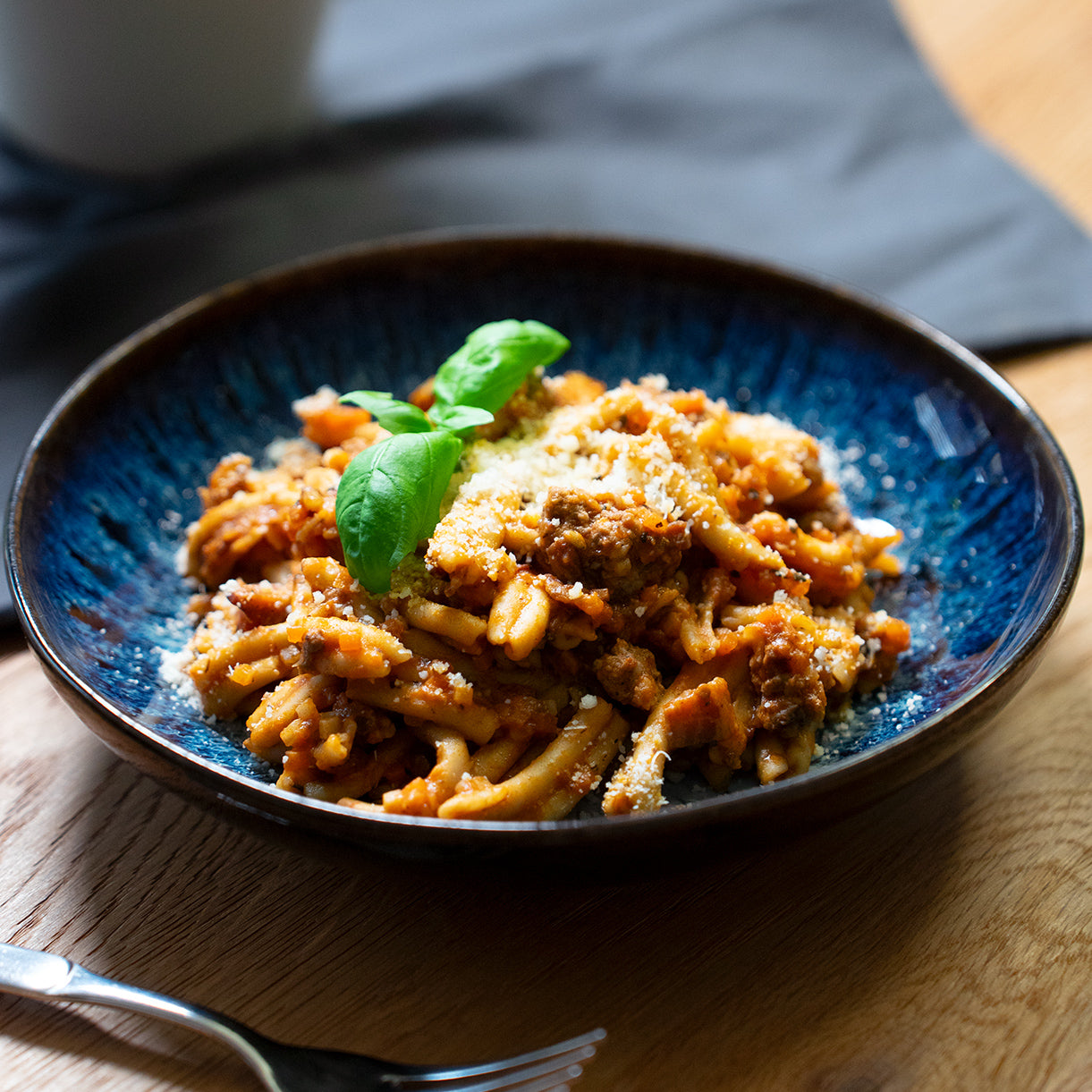 Casarecce gekocht (HARTWEIZENGRIESS, Wasser, Salz), Luganighe CH (Schweinefleisch CH, Salz, Gewürze, Fenchelsamen), Tomaten, Rüebli, SELLERIE, Rotwein (SCHWEFELDIOXID), Sbrinz gerieben (Schweizer Extra-HartKÄSE aus RohMILCH), Speck vom Thurgauer Apfelschwein CH, Tomatenpüree (Tomaten, Kochsalz), Zwiebeln, Rosmarin, Speisesalz, Zucker, Olivenöl* extra vergine, Knoblauch, Maisstärke, Pfeffer bunt (Pfeffer grün, schwarz, weiß, rosa), Thymian, Rapsöl