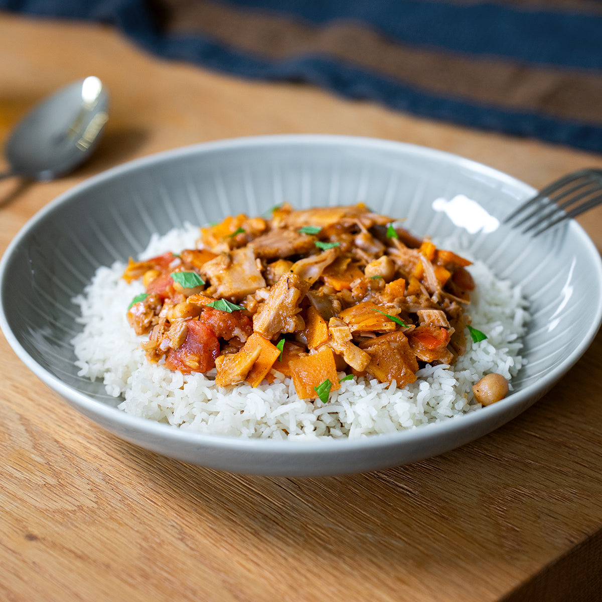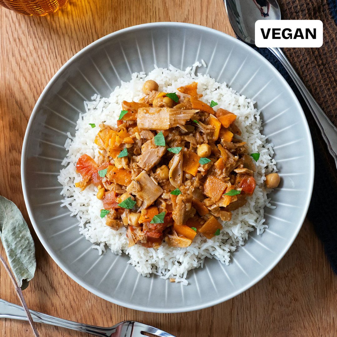 Basmatireis, Jackfruit (Jackfruit, Zwiebeln, Knoblauch, Marinade (Ketchup, Wasser, Olivenöl, Tomatenmark, SOJASAUCE, Zucker, Weinwürze, geräuchertes Maltodextrin, jodiertes Salz, Karamellfarbe: Ammonsulfit-Zuckerkulör, Verdickungsmittel: Guarkernmehl / Xanthan, Knoblauch, Gewürze), Tomaten, Karotten, Gemüsebouillon (Wasser, Meersalz, Hefeextrakt, Gemüse (Kürbis, Karotten, Pastinaken, Tomaten), Speisesalz, Zucker, Petersilie, Olivenöl, Gewürze), Kokosnussmilch (Kokosnussextrakt, Wasser), Zwiebeln, Kichererbsen, Rapsöl, Ingwer, Speisesalz, Korianderkörner, Pfeffer, Paprika, Kreuzkümmel, Maisstärke, Zimt, Lorbeerblätter, Thymian