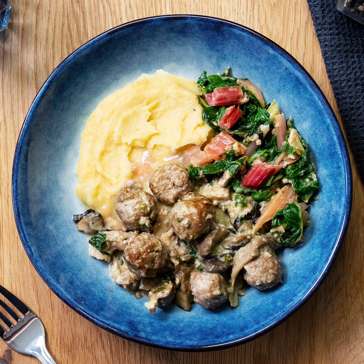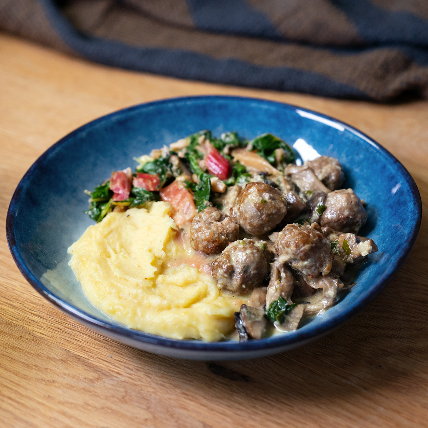 Meatballs vom Weiderind, mit Pilzen, grünem Pfeffer, Mangold & Härdöpfelstock