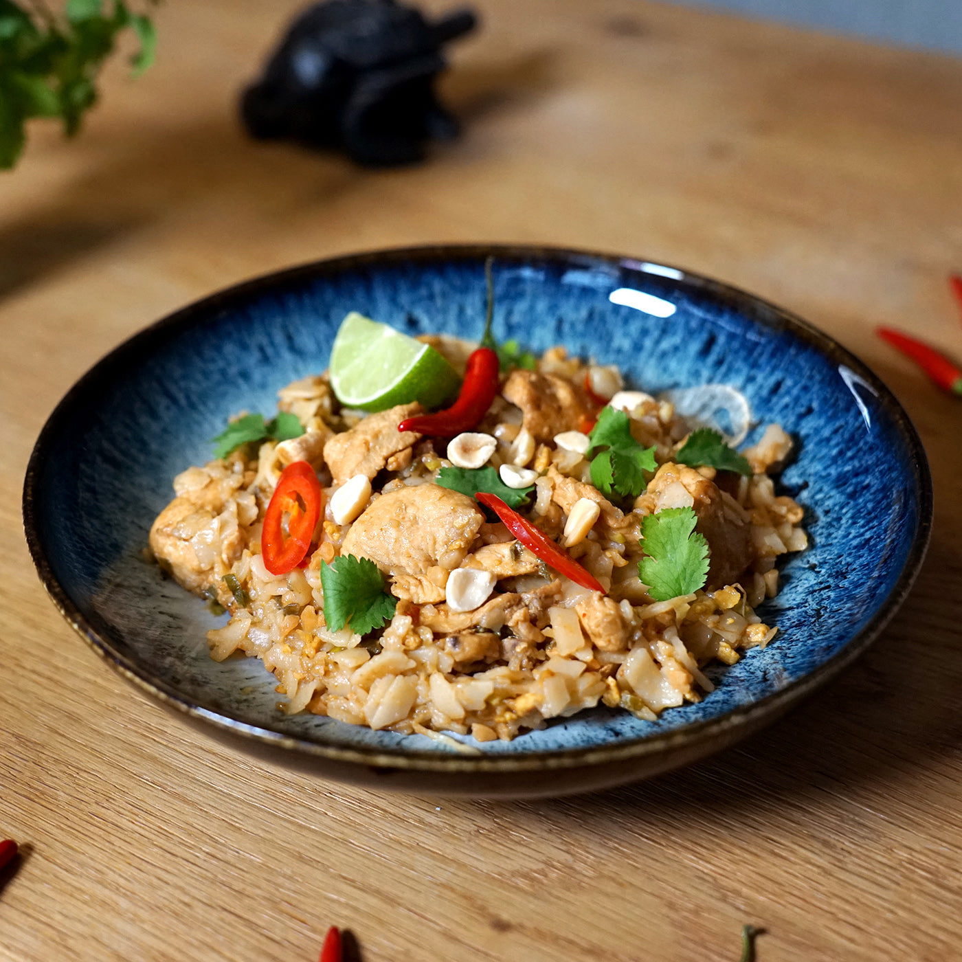 Gebratene Reisnudeln mit Alpstein- Poulet, Ei, Frühlingszwiebeln, Rüebli, Erdnüsse und Thai- Basilikum