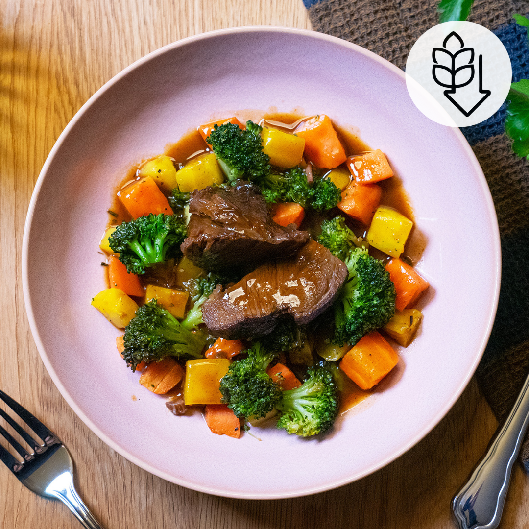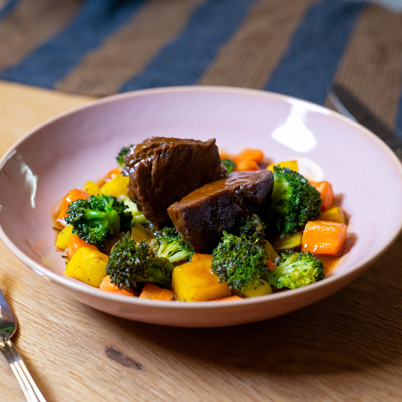 Geschmorte Backen vom Weiderind, mit grünem Pfeffer und Pilzen, dazu Ofengemüse