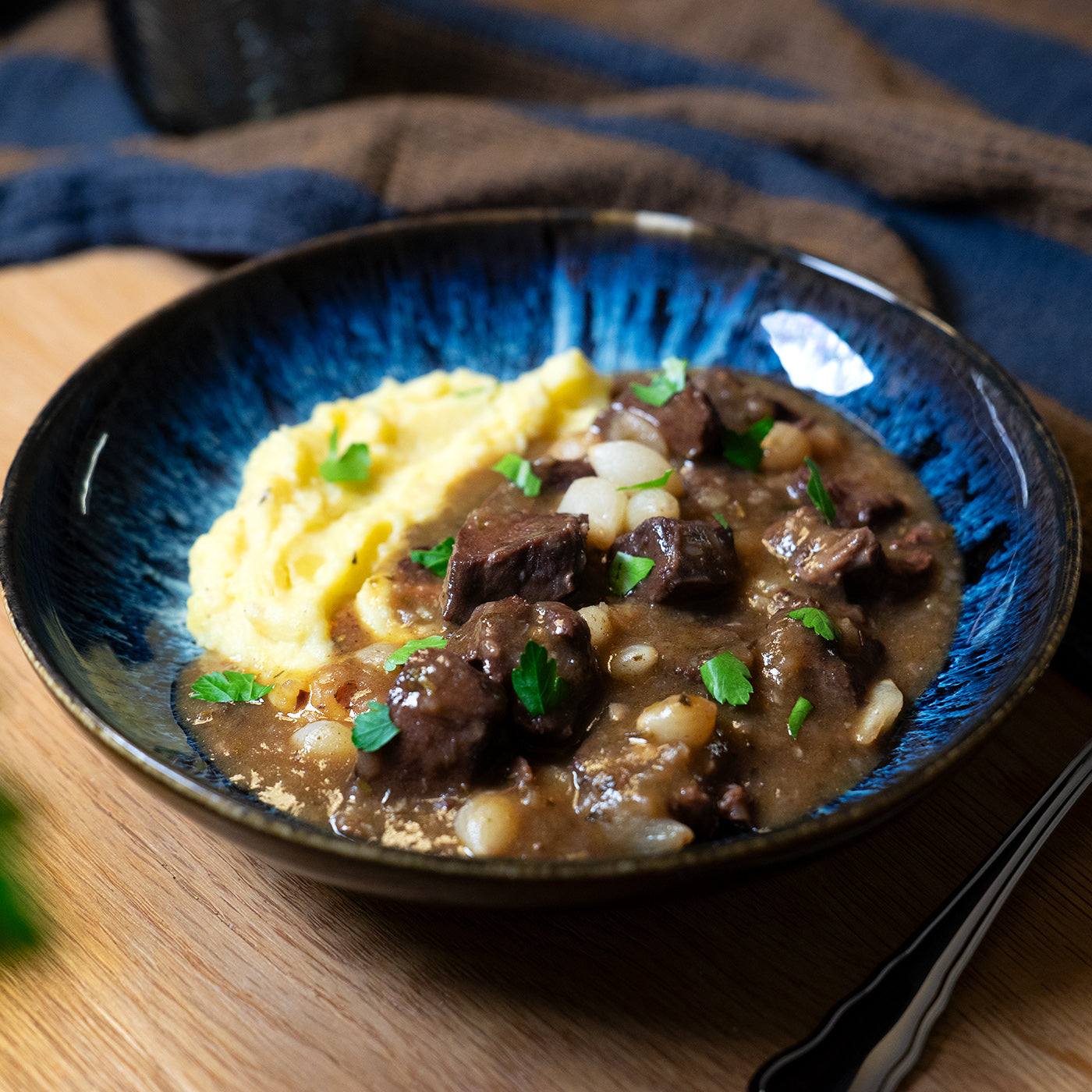 mit Perlzwiebeln, Tomaten und Kartoffelstampf