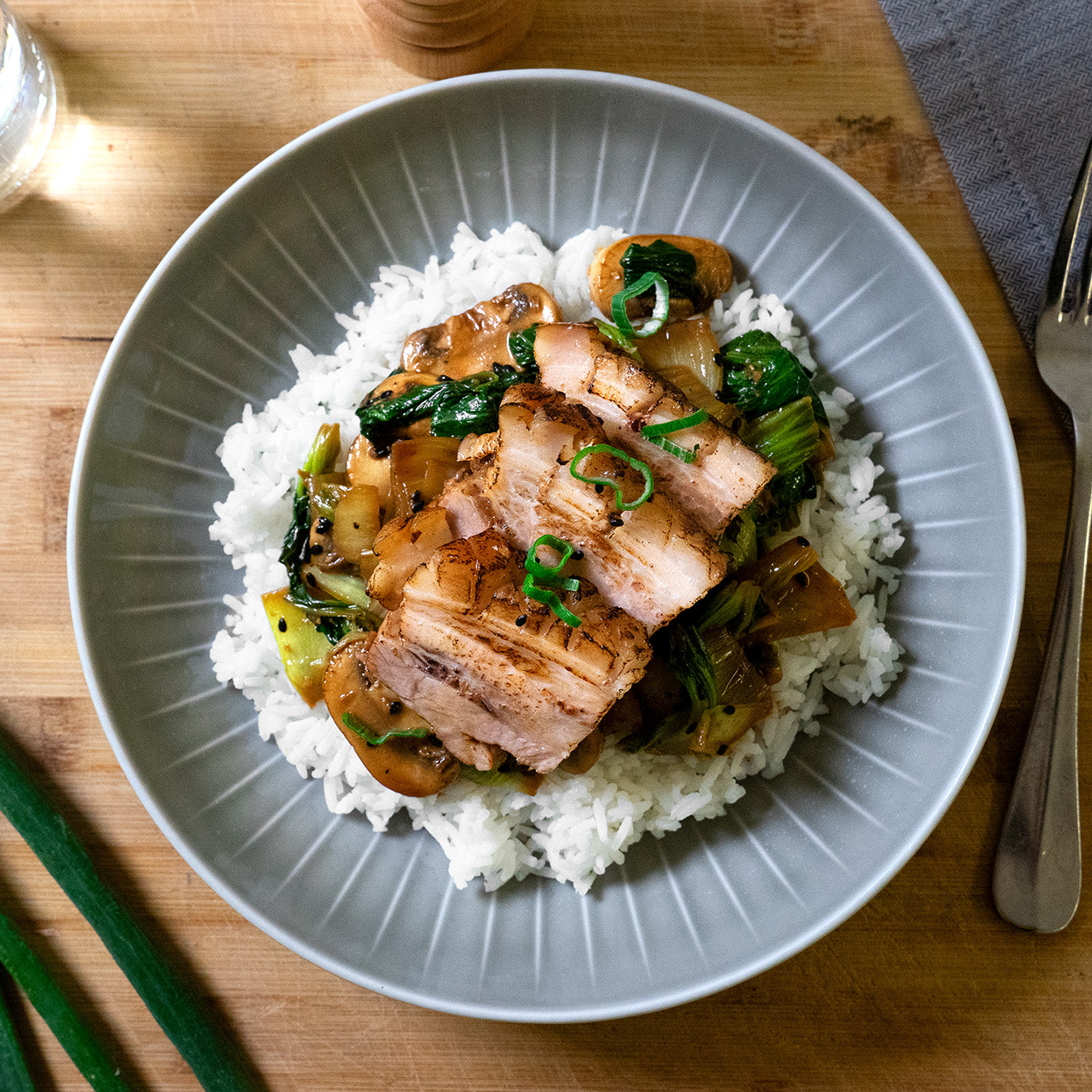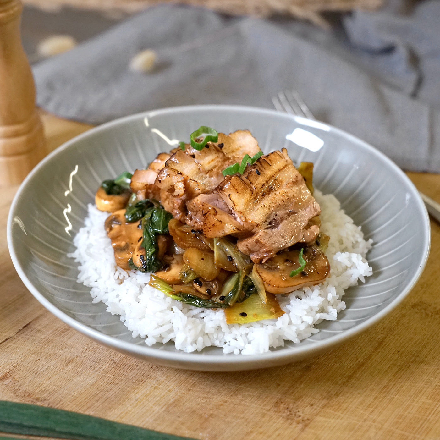 Schweinsbrust, Ingwer, Pak Choi, Reis