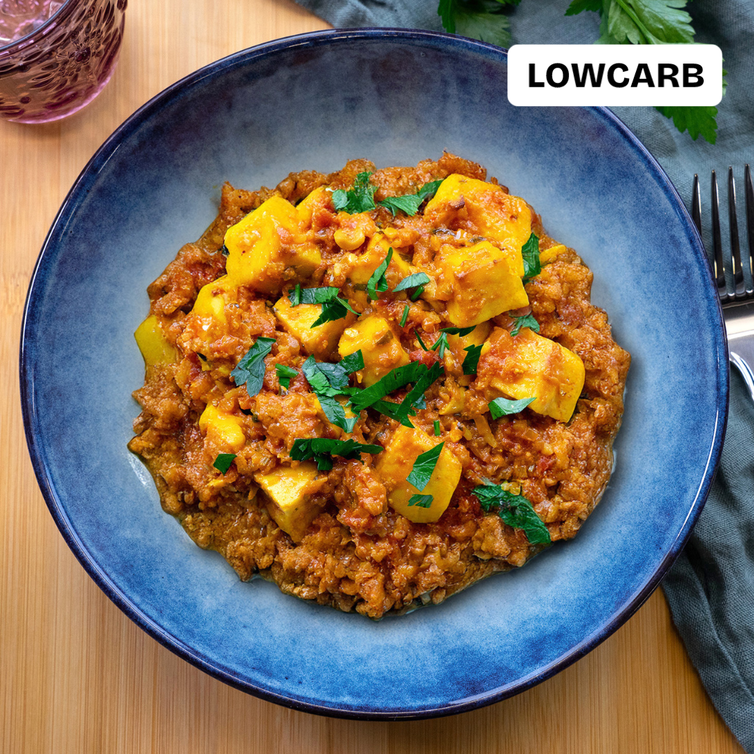 Datteltomaten (IT), Kichererbsen, Paneer (MILCH, LAKTOSE), Joghurt Nature (MILCH, LAKTOSE), Karotten, Zwiebeln, Ingwer, Käsereibutter (LAKTOSE), Cashews (SCHALENFRÜCHTE), Knoblauch, Koriander, Piment, Schnittlauch, Zwiebel, Muskatnuss, Muskatblüte, Anis, Kardamom, Pastinaken, Pfeffer, Zimt, Kurkuma, Galgant, Tomatenpulver, Nelken, Koriander, Rosenblüten, Mohn, SENFKÖRNER, Kreuzkümmel, Olivenöl*, Cayenne Chili, Salz, Pfeffer, Gewürznelken