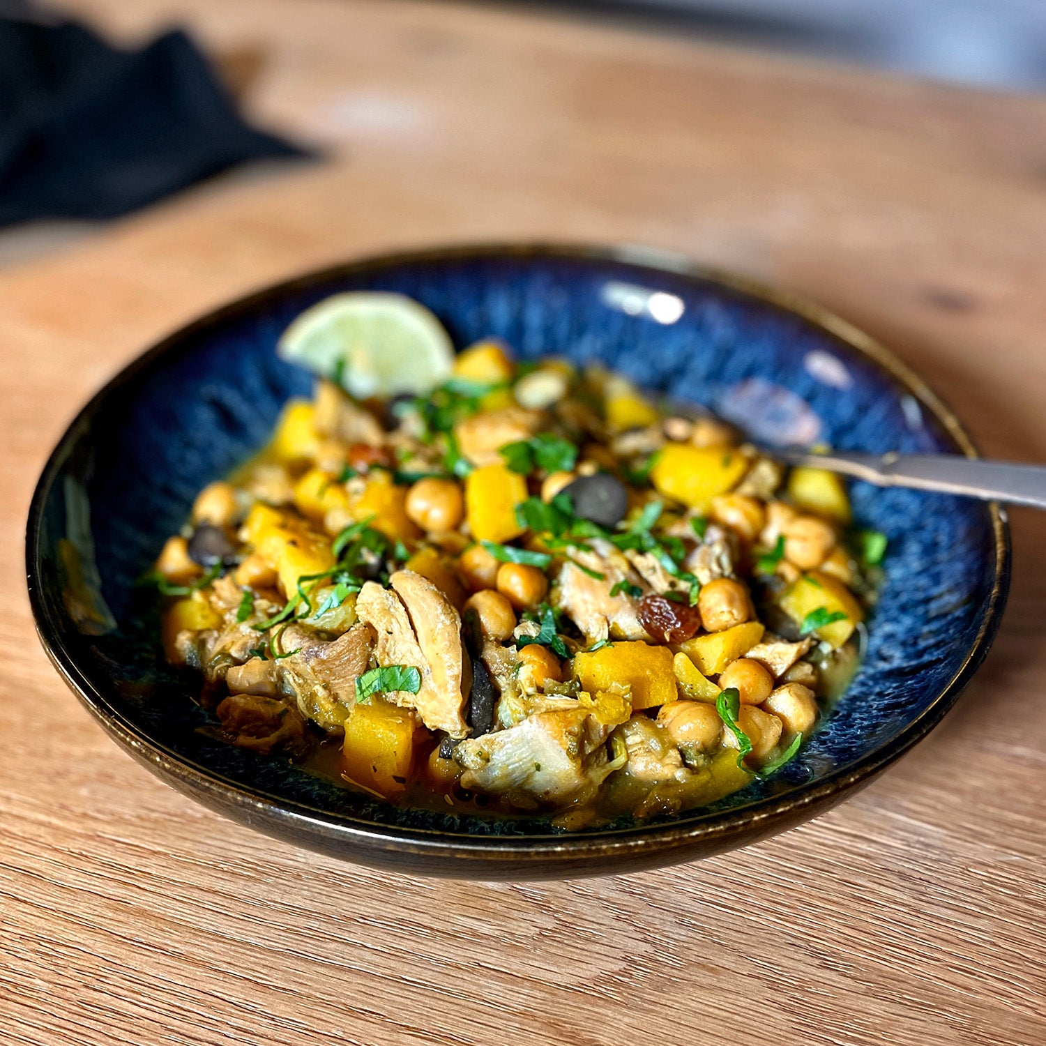 Gemüsebouillon (Wasser, Meersalz, Hefeextrakt, Gemüse (Kürbis, Karotten, Pastinaken, Tomaten), Speisesalz, Zucker, Petersilie, Olivenöl, Gewürze), Alpstein Poulet Schenkelragout CH, Kartoffeln,, Zwiebeln rot, Oliven grün (Wasser, Salz, Säuerungsmittel: Zitronensäure, Milchsäure und Ascorbinsäure), Frühlingszwiebeln, Orangensaft (Zutaten: Orangensaft aus Konzentrat 100%.), Sultaninen blau (Sultaninen, Sonnenblumenöl), Limettensaft, Kichererbsen, Sultaninen golden (Sultaninen, Konservierungsstoff: SCHWEFELDIOXID), Sonnenblumenöl), Max Havelaar Datteln, Peterli, Rapsöl, Knoblauch, Speisesalz, Ras El Hanout (Roh-Rohrzucker, Ingwer, Piment, Schnittlauch, Zwiebel, Muskatnuss, Muskatblüte, Anis, Kardamom, Pastinaken, Pfeffer, Zimt, Curcuma, Galgant, Tomatenpulver, Nelken, Koriander, Rosenblüten, Mohn, Kreuzkümmel, Gewürze), Pfeffer, Safran