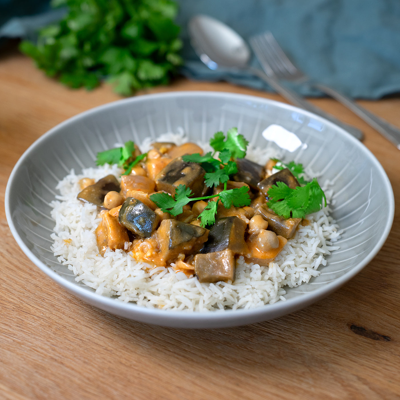 Wambatu-Curry im Sri-Lanka-Stil mit Kichererbsen, Auberginen, Basmatireis, Petersilie, Zitrone und Sweet Chili
