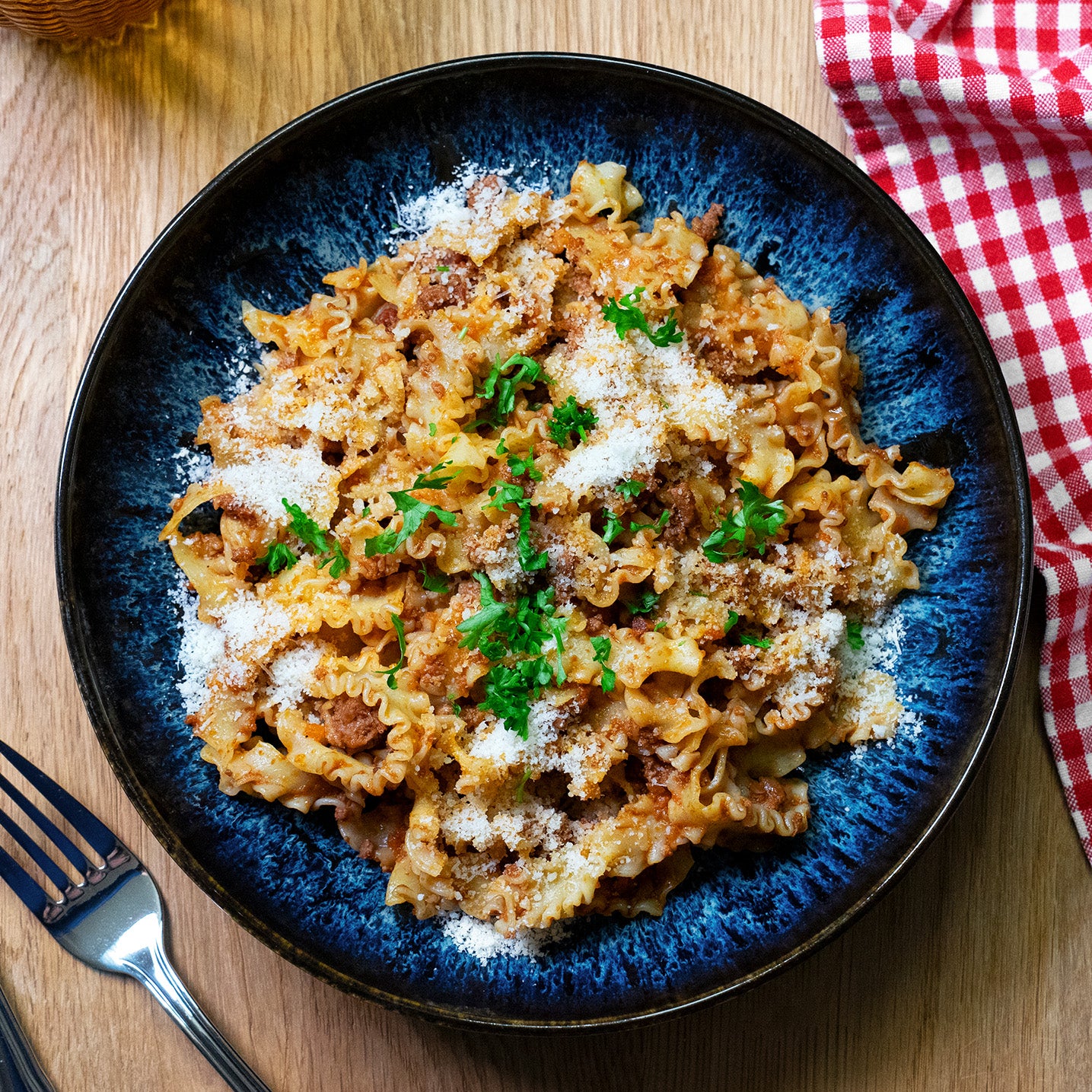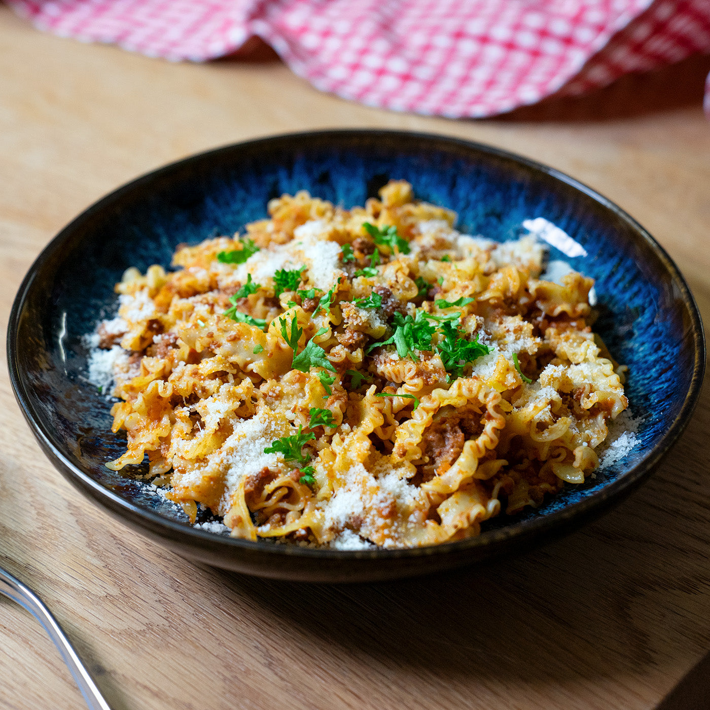 Hausgemachte Eierteigwaren mit Ragu Bolognese, dazu Sbrinz