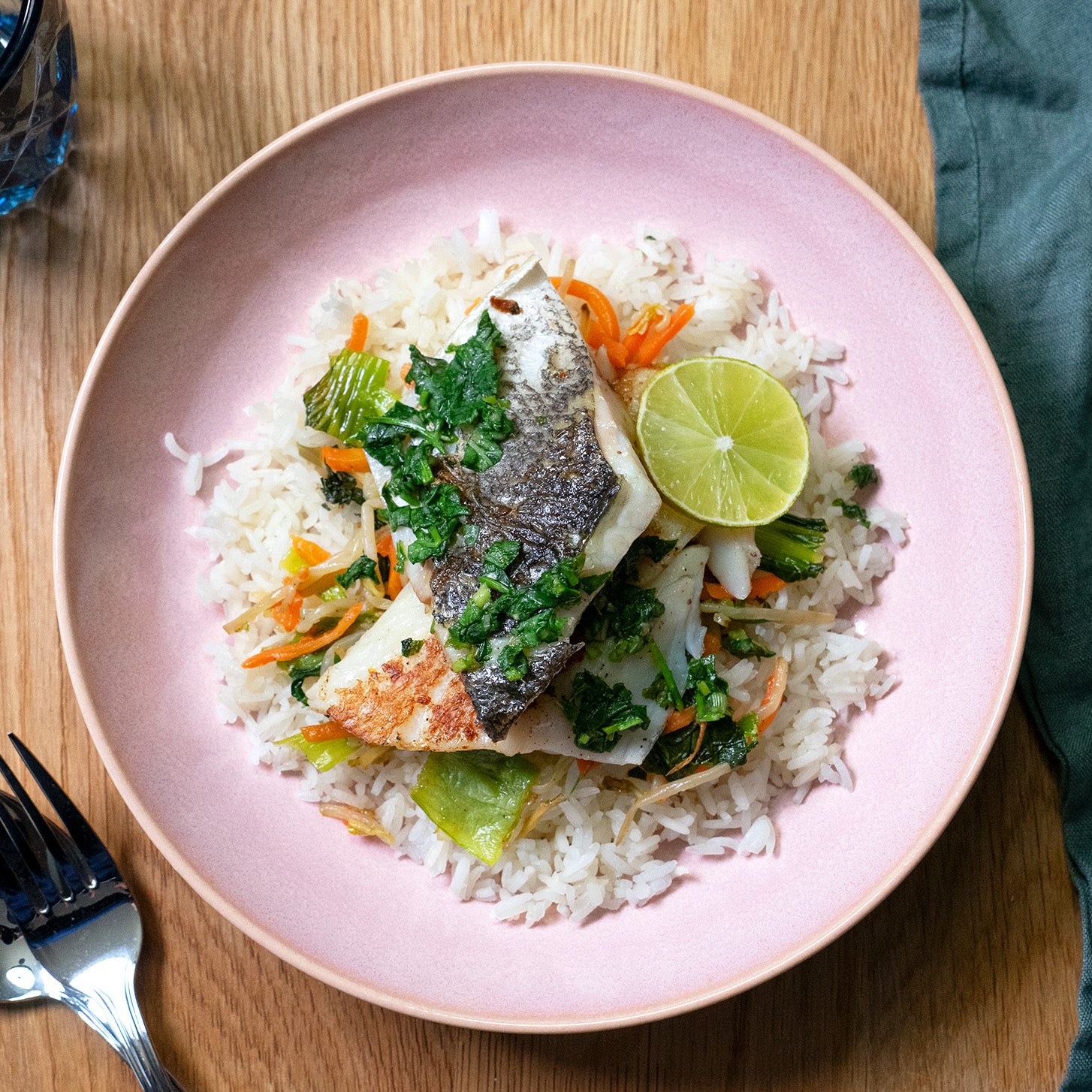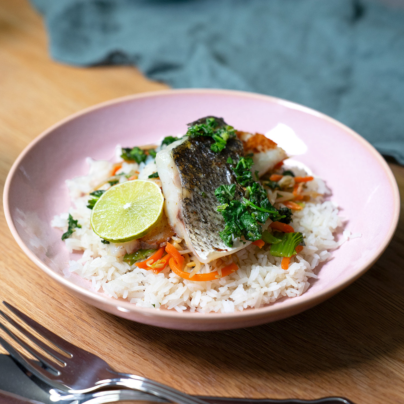 Wolfsbarsch TR (FISCH), Jasminreis, Pak Choi, Karotten, Sprossen (SOJA) Fischfond (Wasser, FISCH, Petersilie, Lauch, Fenchel, Zwiebel, Weisswein, Piment, Salz, Pfeffer, LorbeerblÀtter, Fischsauce (FISCH), Salz, Zucker, Fruktose), Limetten, Rohrzucker, Rapsöl, Ingwer, Sesamöl (SESAM), Knoblauch, Koriander, Thai (SELLERIE), Zitronengras, MaisstÀrke, Speisesalz, Chili