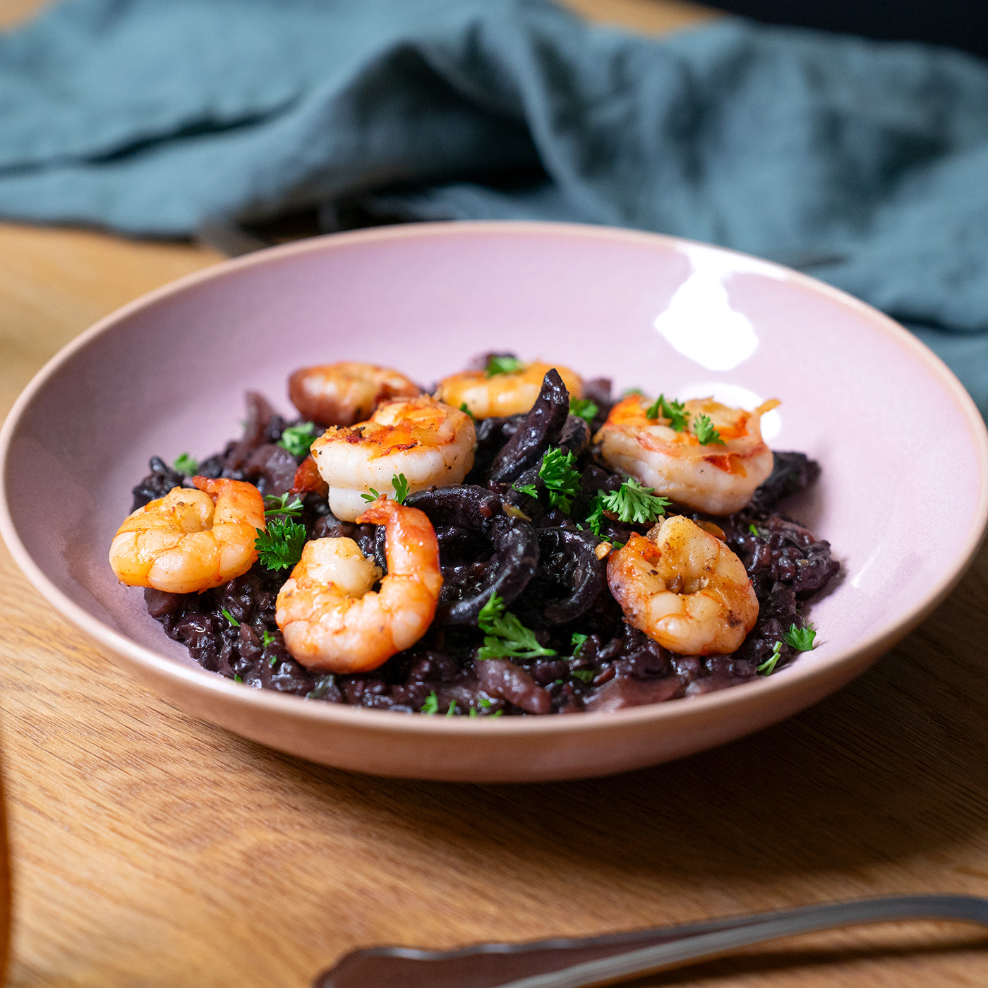 Wasser, SELVA Black Tiger Shrimps (VN)(KREBSTIER), Cherrytomaten, Venere Reis, Calamari (WEICHTIER), Fenchel, Käsereibutter (LAKTOSE), Zwiebeln, Rapsöl, Knoblauch, Olivenöl*, Basilikum, Knoblauch, Salz, Pfeffer