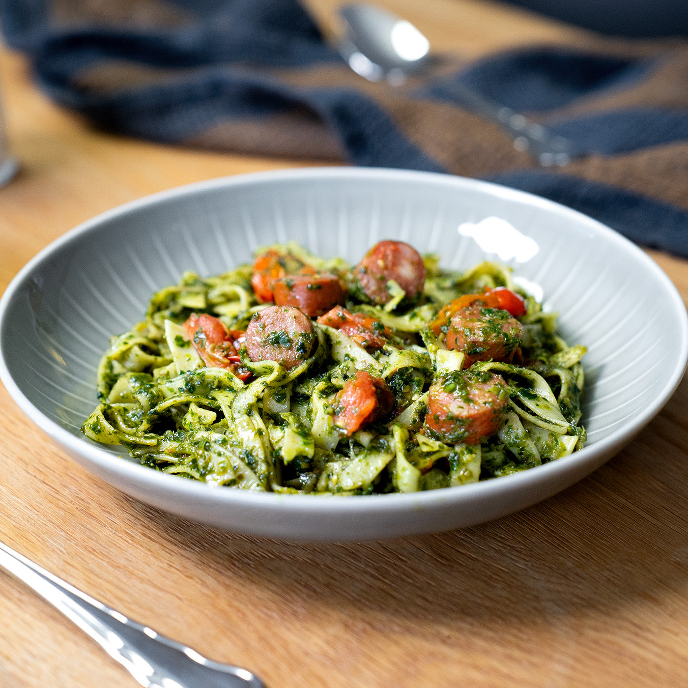 Hausgemachte Tagliatelle mit Grünkohlpesto, Rauchwurst, Cherrytomaten und Parmesan