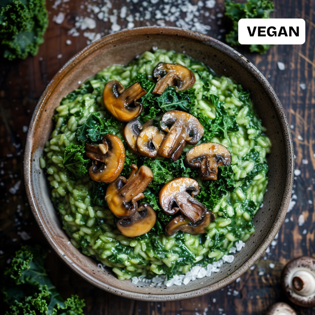 Wasser, Federkohl, Olivenöl*, Gemüsebouillon* (Meersalz, Hefeextrakt, Gemüse (Kürbis, Karotten, Pastinaken, Tomaten), Speisesalz, Zucker, Petersilie, Olivenöl, Gewürze), Grana Padano (MILCH, Salz, Lab, Lysozym (EI), Eier, Milch), Basilikum, Risottoreis (IT), Sonnenblumenkerne*, Shiitake, Champignon, Kräuterseitling, Austernpilze, Zwiebeln, Sbrinz (Schweizer Extra-HartKÄSE aus RohMILCH, Milch), Weisswein ((SCHWEFELDIOXID, SUFITE), Knoblauch, Käsereibutter ((LAKTOSE), Milch), Rapsöl, Peterli, Herbsttrompeten, Salz, Pfeffer