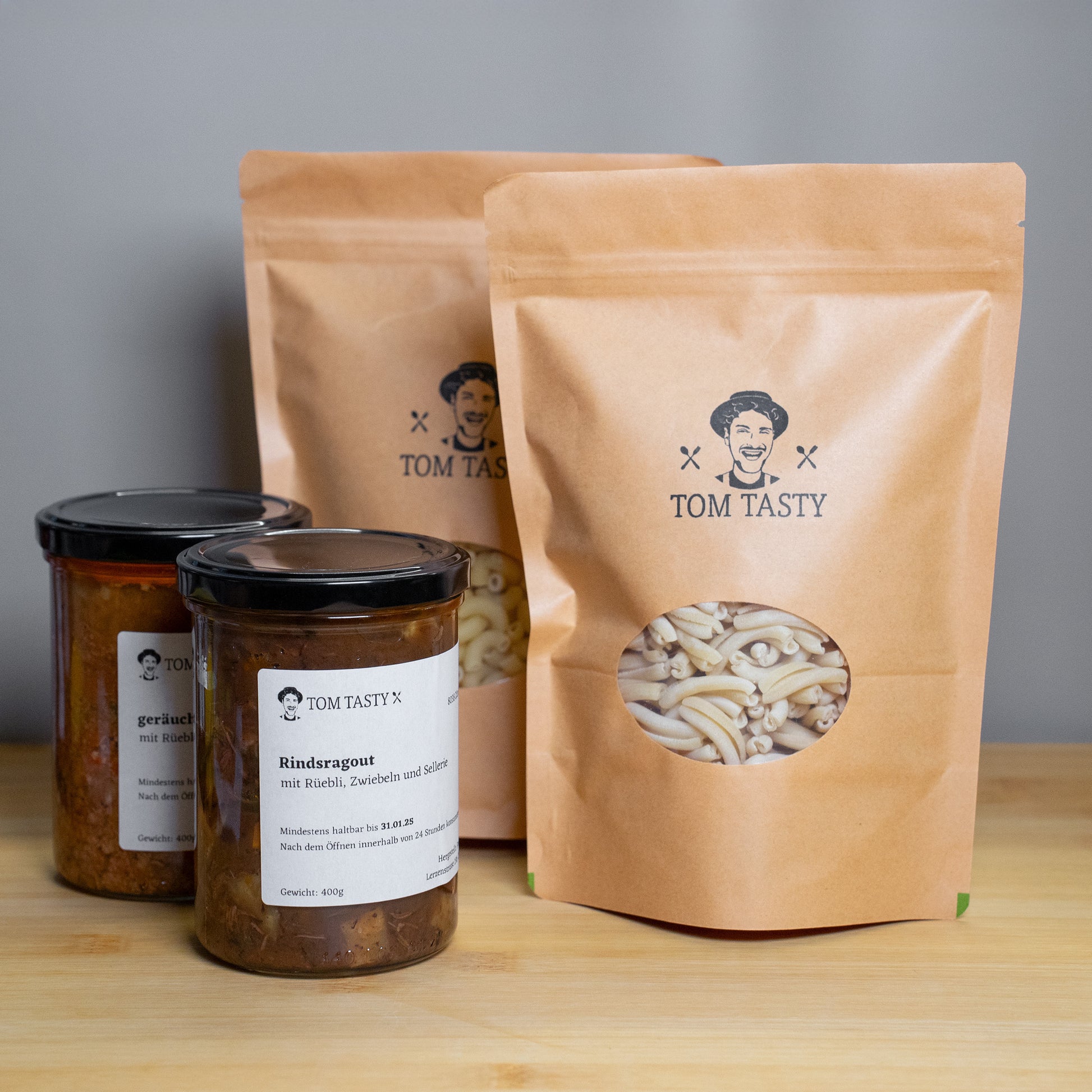 Beide Varianten enthalten ausserdem je eine Packung unserer hochwertigen, getrockneten Pasta: Casarecce (350g) und Hörnli (350g)
