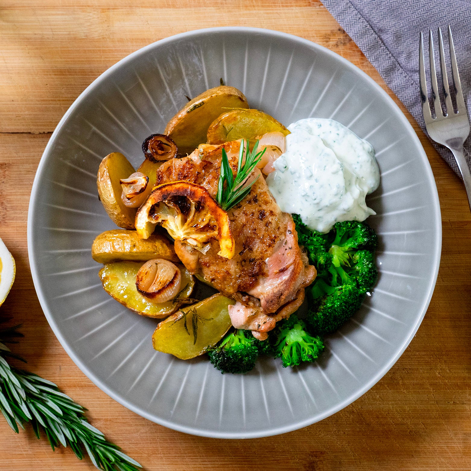Kartoffeln, Brokkoli, Alpstein Poulet Oberschenkel- Steak CH, Zitronen, Rapsöl, Zwiebeln, Magerquark (Pasteurisierte MAGERMILCH (CH), Weisswein (SCHWEFELDIOXID), Basilikum, Rosmarin, Thymian, Speisesalz, Knoblauch, Pfeffer